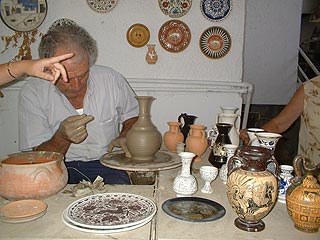 Az idős fazekasmester szemünk láttára készíti el a kancsót, melyet elkészülte után azonnal – kettévág. Miközben sajnálkozva nézzük a műveletet, megmutatja nekünk tettének okát. A kancsó belseje redős, ha vásárolunk majd ajándékot, ebből megállapítható, eredeti-e a dísztárgy, vagy hamisítvány. Ami tucatáru, annak nem redős, hanem „tök” sima a belseje. A szép görög motívumok felkeltik bennünk a vásárlási ösztönt, jó néhány kecses kancsó, amfora, fali tányér talál gazdára, melyek megvásárlása után elégedetten távozunk.