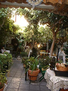 Az Old Town egyik boltíves kapuján át hangulatos kis vendéglő terasza csábított minket betérésre. A kertben Héliosz, a Nap istenét ábrázoló rodoszi kolosszus kicsinyített mása hívogatóan állt szétterpesztett lábakkal, alatta stilizált vitorlás hajó makettje, amint éppen megérkezik a rodoszi kikötőbe.