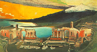 Csontváry ma már nem ismerne rá a környezetre. A hegyi utak, kanyargós viaduktok az ő korában még ismeretlenek voltak. De a táj, amit festett éppen száz évvel (1902) ezelőtt, most is ugyan olyan gyönyörű, mint a festményen. Görög-római színház. Mai, romos állapotában is fenséges látvány. A tenger partján kialakult vulkáni kráterben, félkörívben elhelyezkedő színházat eredetileg a görögök építették. Jelenlegi külsejét az i.sz. II. évszázadban kapta, amikor a rómaiak átépítették, hogy gladiátorversenyek tartására is alkalmas legyen.