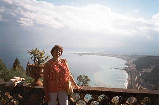 Álmos kíváncsisággal lépek ki a lakásunk ajtaja előtt elterülő kertbe, és szinte beleütközök a látványba. A távoli, esti fények nem is sejttették velünk, hogy milyen lélegzetelállítóan csodálatos élményben lesz részünk a nappali világosságban, s milyen közel van mindez. A kopár, bársonyosan szürkésbarna színű hegy olyan, mintha egy nagy-nagy medve feküdne előttünk mély álomba merülve, szinte csak a kezemet kellene kinyújtanom ahhoz, hogy megérintsem szelíd vonulatát. Tetején Taormina, most nappali fényben.