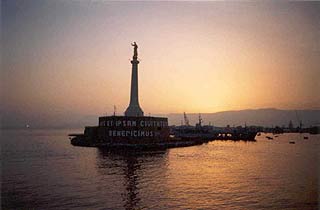 Szemben a parton számtalan apró fény jelzi, hogy Szicília vár minket! Ahogy közeledünk, megpillantjuk a New York-i Szabadságszobor mintájára készült emlékművet, a Szicília védőszentjét ábrázoló Madonnát (1934, Madonna della Lettera, a Leveles Szűzanya). Meseszép látvány, ahogy a szobor feje felett lévő glória halványkék színben megvilágítja a már sötét égbolt alatt álló szobrot, és a körülötte hullámzó tengert. A talapzaton néhány latin szó: Vos et ipsam civitatem benedicimus (Ti és városotok fogadjátok üdvözletemet), melyet a hagyomány szerint a Szent Szűz i.sz.42-ben írt a messinaiaknak.