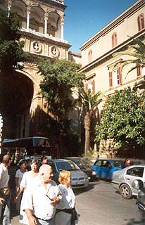 A boltíves városkapun (a képen balra) áthaladva jutunk el a gyönyörű pálmás liget közepén található királyi palotához, ami jelenleg a szicíliai regionális kormányzatnak és parlamentnek szolgál székhelyül.