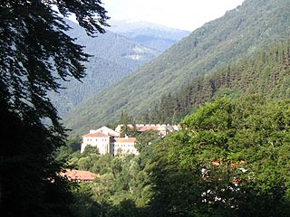 Ennek ellenére remekül aludtunk, a levegő a magasság miatt kellemesen hűvös volt, a patak ott csobogott az ablak alatt, a fenyők pedig kellemes illatot árasztottak. A meglepetés reggel következett be, a kötelező reggeli mennyiségileg és minőségileg is jó volt, a látvány pedig csodálatos, mert a teraszra terítettek, ahonnan reggeli közben ráláttunk a kolostorra.
