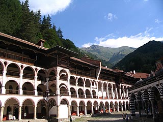 Mi első nap estélyén Rilában szálltunk meg, a Hotel Rilecben. A vocheren az volt írva, hogy a hotel közvetlenül a kolostor háta mögött van. De előtte, ha kedves utazó eltéveszted a rilai bekötő utat, ráadásul erős szembe jövő forgalmad van, ne adj’ Isten még rendőrség is ott serte-pertél az úton, abba a helyzetbe kerülhetsz, hogy a közben eléred a két forgalmi irányt elválasztó terelőket, és kénytelen vagy elmenni egészen Blagoevgrádig. Én legalábbis így jártam, majd ott két záróvonal átlépésével tudtam csak visszafordulni. A kolostorhoz vezető út megfelelő minőségű, kellően kanyargós és emelkedő, de hát 1000 méter fölé kell jutni. A hotel valóban a kolostor háta mögött van, de úgy 300 méterrel. Ráadásul ezt úgy kell érteni, hogy a kolostort el kell hagyni tovább az úton vagy 600-700 méterrel, majd jobbra letérni, áthaladni egy kis hídon ismét jobbra fordulni egy murvás, hepe-hupás útra, amely a kolostor irányában visz vissza. Ha ezt már késő este, sötétben csinálja az ember, bizonnyal összeszedi a következő napi kolostorlátogatásra a káromlások miatti megbánni valót.