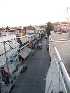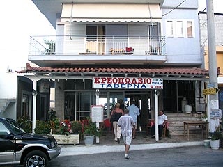 Az ajánlott helyek közül kettőbe látogattunk el, az ott elköltött vacsora nem hagyott mély nyomot bennünk, ára sem volt olcsó, az egyik helyen 65 €, a másik helyen 75 €. Ebben volt 2-3 uzó, egy-két előétel (valamilyen saláta), főétel, 1 liter bor (retzina). Ezzel szemben találtunk a főutcán egy hentest, ahol egyben taverna is működött. A helyet úgy hívják, hogy – de ezt nem tudom leírni, mert nincs ilyen betüzetű klaviatúra – ezért olvassa el, akit érdekel a mellékelt képről. Itt egyszerű grillezett ételeket lehet kapni (persze, ahogy a cégtáblán is látni lehet, volt pita, szuflahi is), de mivel hentes a tulajdonos a húsok frissek, kiválóan elkészítettek, hatalmasak az adagok (ettünk csirkét, disznót, marhát, bárányt – ez különösen finom volt -, májat). Szombatonként egyben fiatal sertést készítenek, aminek a bőre ropogós és a húsa omlós, nagyon jó.