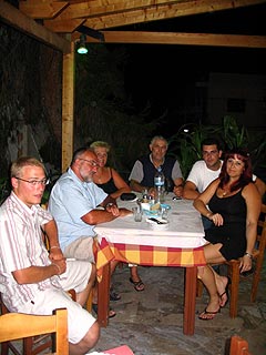 Itt is nagyjából ugyan azt fogyasztottunk, mint másutt, de nem fizettünk többet jattal együtt 50 €-nál. Ja és minden étkezés után kaptunk – egyre növekvő mennyiségű – görögdinnyét. Itt hívta fel a figyelmünket a tulajdonos, hogy van más saláta is, amit érdemes megkóstolni, az nincs az étlapon, úgy hívják, tiros salad. Ez fetából, a cserépedényben árult sűrű yoghurtból, borssal fűszerve, összenyomott fokhagymából áll, tényleg finom. Mi bárkinek tudjuk ajánlani ezt a helyet, biztos nem fogja megbánni, ha ide betér. Készült közös kép a tulajdonossal és családjával is.