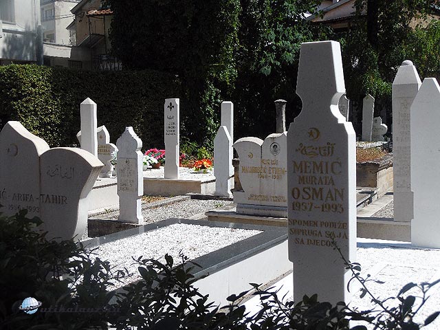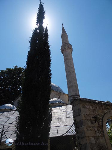 A tenger megvár mottóval, Mostarban bátran sétálhatunk az Öreg hídon túli részeken is. Mi most alkalomszerűen a sétálóutca meghosszabbítása mentén, a piac mellett elmentünk Karadjozbeg mecsetig. Mostar legrégebbi mecsete súlyos károkat szenvedett a közelmúlt háborújában. Ezt a mecset kapuján is láthatjuk, mint ahogy a mecsetet körülvevő sírkert sok-sok fejfáján is ott van az évszám: 1993.