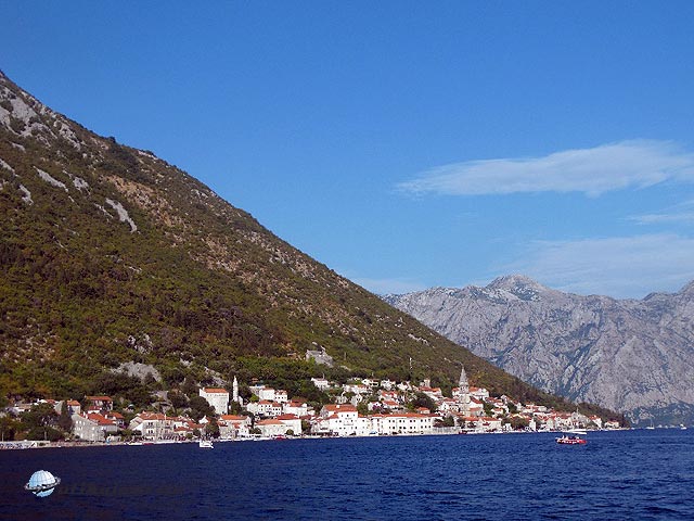 Perast, egy terepasztal, amelynek kirakói a hegyek, a tenger és a velencei házak, a tengerben pedig két sziget. Lenyűgöző látvány.