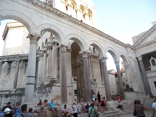 Split igazi pezsgő, dalmát város. Római hagyományok, Diocletianus palotája, középkori templomok, kis utcák, hömpölygő tömeg, patinás épületek, tengerparti sétány és komoly forgalmú kikötő.