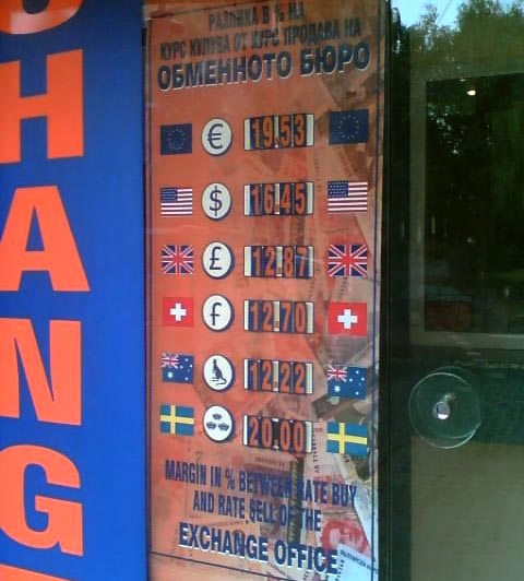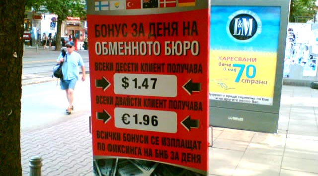 Minden második sarkon találni viszont hivatalos pénzváltó ügynökséget, bolgárul “cséjndzs bjuró”. A tengerparton nincs sok olyan hely, ahol a normális 1.95-öt megadják az euróért, a tipikus árfolyam az 1.88-1.91, de azért lehet ilyet is találni, esetleg kicsit távolabb a főutcától.
