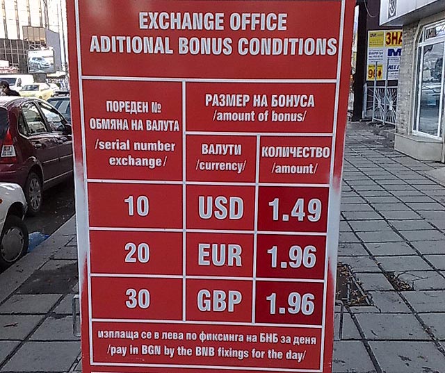 A másik trükk, hogy az árfolyamtábla alján van egy apróbetűs (de azért simán olvasható!) felirat, amiben 8% körüli jutalékról írnak bolgár ÉS angol nyelven. Ebben az a trükk, hogy sem a számot nem írják számjeggyel, sem a százalékot a % jellel, így az embernek nem igazán tűnik fel, miről is van szó.