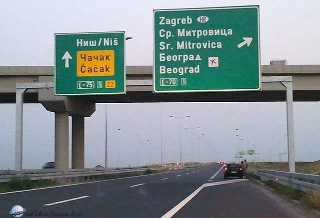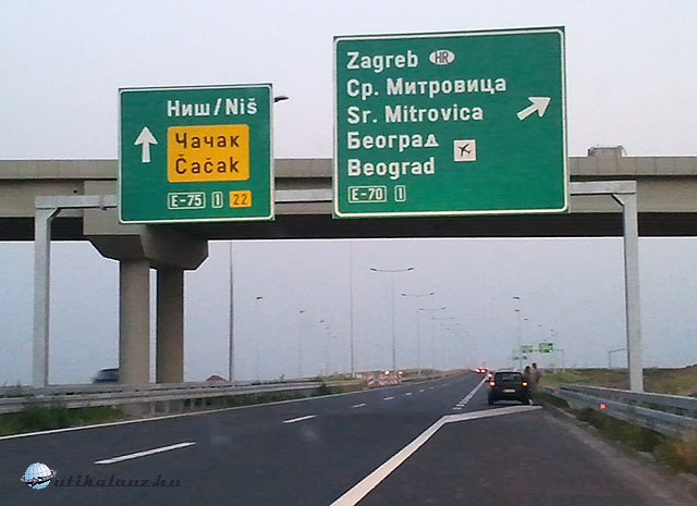 Látjuk a táblaszövegezők trükkjét: a Belgrád feliratot legalulra bújtatták el, miközben az E75 és Niš roppant hívogatóan a tábla fő helyét foglalja el. De minket nem lehet könnyen becsapni, pedig még azt a trükköt is bedobják, hogy a repülőtér jelét is kiteszik a táblára, és nem nagyon hangsúlyozzák, hogy egyfajta alternatív tranzit útvonalról van szó: