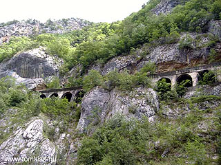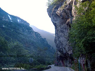 766-km-nél, 09.25-kor jön Mojkovac, vagy ahogy elneveztük, a „Szörpváros”. (Az út mentén mindenhol szok-, lekvár- és gyümölcsárusok, egész nap a tűző napon is, beláthatatlan kanyar mentén, emelkedő közepén stb. Fura üzletpolitika, és szomorú szegénység.) Jön a „Betonska galerija”, egy félig nyitott betonalagút. Kolašin (789 km, 10.20) után nem sokkal, a Morača-kanyon előtt állunk meg először Montenegróban kávézni, a Tara-folyó mellett. (Kb. 40 eurócent volt a kávé.) Innen kezdődik a fenséges és lenyűgöző Morača-kanyon. Egyszerűbben fogalmazva: beszarás, olyan szép, pedig negyedszerre látom. Igaz, most inkább az útra kell figyelni, mert minduntalan előznek az előzni tilosnál, a záróvonalon keresztül, és egyáltalán, majd’ minden szabályt folyamatosan megszegnek. Több alagút-felújítást is érintünk, ahol szemaforral irányítják a forgalmat, ám szerencsénk van, és a legtöbb helyen éppen zöldet kapunk. Próbálunk fényképezni a mozgó kocsiból, de a kanyonhoz több nap kellene, gyalogosan, és különben sem képes a fotó visszaadni semmit.