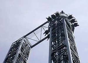 A különlegesebb attrakciók egyike a Columbia & Discovery. Tucatszor fordultunk az ismételt kilövésért, vagy szabadesésért. Ez két, egymás mellett felállított 65 m magas torony, mindkettőn egy függőlegesen mozgó, 12 főt befogadó “futómacska”. A Columbián a beszállást és rögzítést követő visszaszámlálás után 3,5 g gyorsulással lőnek ki, és kb. 2-3 másodperc alatt éri el az ülés a 65 m-es torony tetejét. Az embernek az az érzése, hogy továbbszáll a semmibe, mielőtt fékezni kezdene a torony csúcsa előtt. A Discovery nyugodt tempóban visz fel a torony tetejére, majd egy kattanást és a sűrített levegős szelepek nyitását követően -1,5 g gyorsulással, azaz a szabadesés másfélszeresével indul lefele az ülés, amitől felemelkedünk az ülőkéről és a felső leszorító kerethez tapadunk. 80 km/h zuhanási sebesség elérése után hirtelen 3,0 g-s fékezés, majd visszalövés kb. félpályáig. Többszöri menet után éreztünk rá, hogy teljesen ellazulva, a karfák görcsös markolása nélkül rendkívül élvezetes a móka.