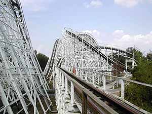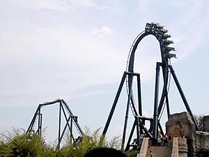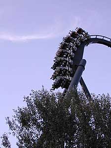 előrecsúszást akadályozó perem. A felülről ránk csukódó párnázott acélkeret a vállakat, mellkast, hasat és combokat egyaránt leszorítják, abszolút bekalodázva a résztvevőt. Beszállás után központi reteszelés, dudaszó és zöld lámpa, – indul a bevetés. Az 1200 m hosszú pálya 50 méter magasságra történő, majdnem függőleges vontatással kezdődik. A tetején mintha megállna a vonat és az idő is egy pillanatra. Talán van még visszaút? Csak a nagy semmit látjuk 50 méterrel magunk alatt. Kattanás, légfékek kioldása, tizedmásodpercnyi teljes csend, aztán… Ráfordulunk a kicsit megcsavart, szinte függőleges első szakaszra és mielőtt eszmélnénk, eltűnünk a mélyben. 110 Km/h sebességet érünk el az első völgyben és közel 4 g-s terhelés passzírozza testünket az ülésbe. Innen rögtön az első függőleges hurokra megyünk, ismét közel 50 m-es magasságra, másodperc alatt. A hurok tetején lábaink égnek állnak, és teljesen elveszítjük térérzékünket. Ezt követően egy vízszintes orsó, azaz 360 fok a tengelyünk körül. Majd a kobrára jutunk, ahol két fél hurkot egy fél orsó köt össze. Én sem értem, hogy hogyan, hiszen azt sem tudom, hogy hol vagyok. Az ezt követő zuhanásnál már-már azt hisszük, hogy földbe csapódunk, amikor egyszer csak minden elsötétül. Egy föld alatti alagútban vagyunk, és hűsítő permetet fújnak ránk. A legjobbkor. Az alagút után ismét magasra hágunk, és innen egy függőleges tengelyű dugóhúzóba érkezünk. 360 fok vízszintesen, majd egy-két levezető flikk-flakk után begördülünk az állomásra. Még most is kivert az emlékektől a víz, nem hogy ott.