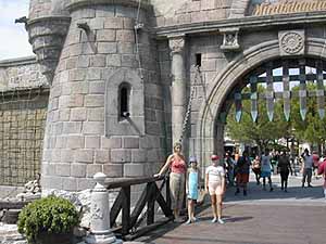 A bejárat stilizált vár nyitható híddal. A kapun belül természetesen az elmaradhatatlan souvenir boltok, amelyek középkort idéző épületekben, egy hatalmas szökőkút körül kaptak helyet. Itt fogadnak már a számtalan étterem, gyorsétterem és pizzázó előörsei is.