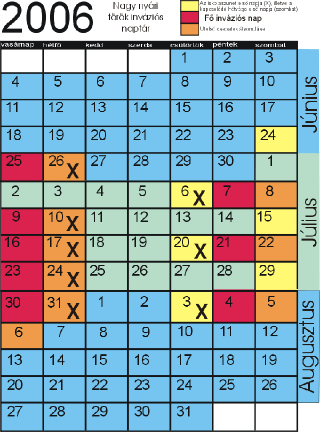 Nem tudom ki, hogy van vele, de mi már tervezgetjük a jövő évi (2006-os) nyaralásunkat. Nagy valószínűséggel jövőre is Görögországba megyünk, de ez még változhat. Az idei, illetve a korábbi évek kellemetlen tapasztalataiból kiindulva készítettem egy kis naptárt, amiben bejelöltem azokat az időpontokat, amikor a Németországban dolgozó, gyermekeiket ott nevelő, iskolába járató török nemzetiségű szülők nagy valószínűséggel „lecsapnak” a határátkelőhelyekre.