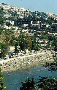 A szállodából ráláttunk a tengerre. Jobbra és balra sziklás tengerpart kiépített strandokkal, sűrü fenyvesek árnyékában.