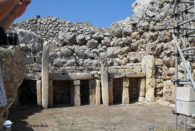 A korai reggeli után már 8-kor volt az indulás és irány Gozo. A komphoz (4,65 euro a retúrjegy) fél 9-kor értünk, kis sorban állás után az autók mellett beszálltunk a hajóba és a fedélzetre mentünk. A jegyeket majd csak a visszaúton kellett kezeltetni, ahol egy terminálon keresztül engedik be már rögtön a fedélzetre az utasokat. Tízkor a Megalitikus templomnál kezdtünk, rövid sétát tettünk benn és kinn egyaránt.