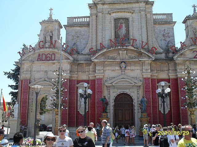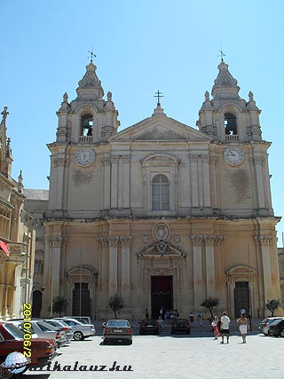 Reggeli után fél 9-kor jött a busz értünk és egy közel 20 éve kinn élő magyar hölgy volt az idegenvezetőnk. Az északi parton mentünk végig és sorban felszálltak az utasok, akik az utazási irodával jöttek. Először a Mosta-i dómba mentünk, majd a Mdina-i városfal mellett álltunk le. Innen sétáltunk el a Szent Pál társkatedrálishoz (jobról), ahová sajnos nem tudtunk bemenni, mert éppen mise volt.