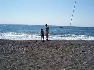 Első napokban felfedeztük a fekete, aprókavicsos part legjobb helyeit. A gyorsan mélyülő, hullámzó tenger nem éppen a legideálisabb kisgyerekekkel strandolóknak, de “uszonyokkal” és szülői segédlettel nagyon élvezik a gyerekek is. A part nagyon látványos a Mesa Vouno-hegy lábainál. Kipróbáltunk több parti éttermet, végül a To Kati Allo nevűbe mentünk többször is vissza-ez kicsit bentebb van az üdülővárosban – ezért olcsóbb is. Itt minden alkalommal ajándék desszertet is kaptunk, és hagyományos görög ételeket kóstoltunk végig, nagyon finom tenger gyümölcseiből készült tálról csemegézhettünk.