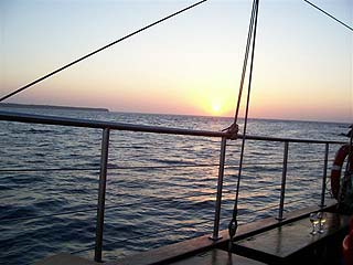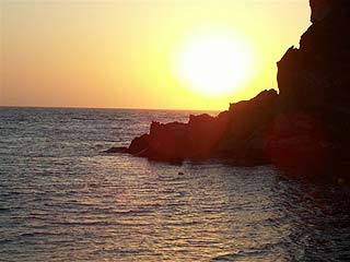 A hajón nem voltunk sokan, így zavartalanul gyönyörködhettünk a látványban. Borral, szendviccsel kínált a hajó személyzete, majd elfogyasztottuk a görög ételekből álló svédasztalos vacsorát. Közben lassan ment le a nap, az öbölben megállt a hajó, és gyönyörködhettünk az igazi santorinis naplementében.
