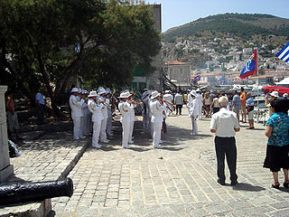 Szállásunkat (régi emlékeink alapján) Tolo – Assini – Drepano térségében szerettük volna megtalálni, de a környék annyit és olyan negatívan változott, hogy továbbmenekültünk, a félsziget ezen nyúlványán dél felé szebb helyeket és több nyugalmat remélve. Vagy a szombati időpont nem volt szerencsés (ekkor minden athéni kimenekül a városból a tengerpartra és ez a rész túl közel van a fővároshoz), vagy a szerencsénk hagyott el minket, de nehezen és csak a félsziget déli végére érve sikerült megfelelőnek tűnő helyet találnunk, Porto Heli közelében (Tzemi, Studios Anastasia 55 euró/éjszaka). Következő napra a kevés sétát igénylő hidrai hajókirándulás tűnt jó programnak, fel is pattantunk Porto Heliben a Flying Dolphin menetrendszerint közlekedő szárnyashajójára és 45 perc alatt átrohantunk fehér csíkot kavarva a tintakék tengeren Hidra mesés kikötőjébe (23 euró/fő oda-vissza). Érkezésünkkor már felsorakozott a fehér ruhába öltözött haditengerészek zenekara és a díszelgő matrózok csapata, fess tisztekkel és tiszthölgyekkel az élen. A gyönyörű népviseletbe öltözött helyiektől megtudhattuk, hogy a görög tengerészek ünnepére érkeztünk meg. Rövidesen a kikötő előtt horgonyzó rombolóról megérkeztek a vendégek is a mólóra, majd a haditengerészet helikopteréről koszorúkat dobtak a móló előtt a tengerbe, hőseikre emlékezve. Rövidesen elvonultak a vendégek, a tengerészek és ünneplők megtöltötték a sok lelkes turistával együtt a kisváros kávézóinak, éttermeinek teraszait.