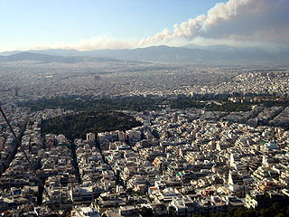 ![]() Athéni panoráma erdőtűzek füstjével |