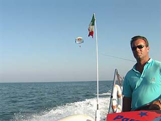 Az élmény felejthetetlen. Mindenkinek ajánlom akit érdekel, mert nagyon jó. Beültetnek egy hevederbe, még kimászni sem lehetne belőle, nemhogy kiesni. Kb. 150- 200 m magasra emel fel. A csónak lent csak picinek látszik és a hangjai is csak távolinak tűnik. Nagyon messze ellátni, nemcsak az egész strandot, hanem még a szomszédos városba Lignano-ba is átláttam. Láttam a strandtól jó messze a parton egy klasszikus fehér világítótornyot. Gondoltam elmegyünk oda, de sajnos ez később elmaradt. Mindenkivel, aki ezt a szórakozást kipróbálja náluk, megcsinálják, hogy közben egyszer leállítják a hajót és hagyják, hogy a lába éppen vizet érjen. Ekkor újra elkezdik vontatni és az ernyő újra felemeli. Nálam ez olyan jól sikerült, hogy pár másodpercig szántottam a vizet, mert már derékig elmerültem, mire elindultak. De ez a fürdő éppen jólesett. Ha még egyszer lesz rá alkalmam biztosan újra ki fogom próbálni, és ajánlom mindenkinek. Kb. 7500,-Ft-ba került fejenként.