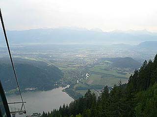 Szerettünk volna látni igazi nagy hegyeket. Én úgy gondoltam – amint később kiderült nem helyesen -, hogy az Alpokban bármerre megyünk, mindenhol csak hegyeket találunk. Nos, ha valaki ezt szeretné annak azt tanácsolom, hogy előre jól megtervezett, lehetőleg turista útvonalon menjen, amit a térképek zölddel jelölnek. Mi nem így tettünk, és a hegyeket csak messziről láttuk. Mivel németül sem és angolul sem beszélünk igazán, így nehezen tudtuk megkérdezni, merre menjünk, hogy ilyet lássunk. Hosszas keresgélés után ráakadtunk a Gerlitzen csúcsra (2500 m), melyre dupla felvonóval mentünk fel. Az első szakasz fülkés felvonó volt, és szinte függőlegesen emelkedett. Aki még nem ült ilyenben, annak először kicsit hátborzongató, ugyanakkor nagyon gyönyörű. Aztán úgy 1500 m-től már enyhébben emelkedő, nyitott sífelvonóval mentünk tovább. Fent felejthetetlen és hideg élményben volt részünk. A tó, melynek partjáról indultunk, csak kis foltnak tűnt a mélyben. Nem bántuk meg, hogy időt és pénzt szántunk rá.