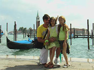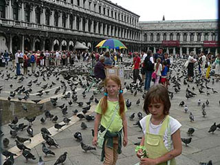 Velence egyébként elég drága hely a Bibionéban megszokottakhoz képest. Etettünk galambokat a Szent Márk téren. Itt lehet venni kis zacsikban madáreleséget 1 euróért. Ezt nagyon szeretik a galambok, akik százával vannak a téren. Csak ki kell tartani az embernek a kezét és tucatszám szállnak rá a madarak és csipegetik az ember tenyeréből a magokat. Ami számomra meglepetés volt, hogy sehol nem lehetett látni madárürüléket. Bizton minden éjszaka mossák a teret. A Dózse palotába sajnos nem tudtunk bejutni, mert 2 órát is kellett volna sorba állni. Viszonylag kis területeket tudtunk bejárni, mert a gyerekek nem igazán bírták a sok gyaloglást és a meleget.”Hazafelé” ismét áthaladtunk egy kis záporon, de mire visszaértünk már jó idő volt.
