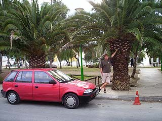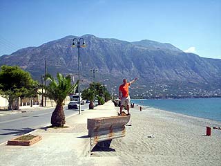 1000 méter magasságban a nagy szél egy fát a hegyi útra döntött. Mi érünk oda harmadiknak. A másik két autós odajött hozzánk, és görögül elkezdtek magyarázni, de mivel nem értettük meg egymást ezért legyintettek, és lesték ki jön még arra az úton. Kb. 10 perc múlva egy platós kisteherautó is befutott. Akkor értettem meg mit akarnak. Láncfűrészt reméltek minden érkező kocsiban. A kisteherautóban éppen volt egy: Gyakorlott mozdulatokkal szétvágták negyed óra alatt a fát és ismét szabad volt az út. Gyönyörű, felhőben úszó hegycsúcsokat láttunk, de egyre hűvösebb lett, így visszatértünk a városba. A Volos feletti hegyeket mindenkinek nyugodt szívvel ajánlom, aki érintetlen Görög hegyi tájakra kíváncsi. Volosnak, mint általában minden görög városnak a sétálóutcája a tengerparton helyezkedik el. A kikötő után gyönyörű, széles tengerparti sétány fogadott bennünket. A városban parkolóórák vannak, de a kikötő nagy parkolójában ingyen parkolhattunk. Ott leállítva a kocsit a kikötőhöz közel eső sétány elején egy igazi halétterembe ültünk be. Tengeri herkentyűket rendeltünk. A pincér rábeszélt minket a "Shrimp Saganaki"-ra. Elmondása szerint lecsós alapba fetasajtot olvasztanak fel, és abba pár percre bedobják a friss garnélarákot. Tűzálló cseréptálba teszik, és a tetejére plussz sajtot olvasztanak egy sütőben, majd tálalják. Többek közt ilyet is rendeltünk, ami azonmód kedvencünkké vált. Ahol lehetet, shrimp saganakit kértünk. Soha nem volt két hely ahol ugyanúgy készítették volna. Volt ahol kis borral, volt ahol savanyú citromlével, volt ahol sűrűbbre, volt ahol több vagy kevesebb sajttal csinálták. A volosi volt a legjobb, mert ott egy kis bort is tettek az alaplébe, így téve karakteressé a szósz ízét, ami mindemellett enyhén csípős is volt. Kértem apró tengeri sült halat is, de a pincér elmagyarázta, hogy mikor a hold állása olyan, mint ezekben a napokban, akkor nem lehet ilyen kis halakat fogni, mert mélyen beúsznak a tengerbe. Készségesen elhittem, és rendeltem mást. A kiadós estebéd megtette hatását, az álommanók elkezdtek támadni. Gyorsan kocsiba ülve 10 perc múlva már hotelünknél voltunk. A szállodától 5 percnyire lévő homokos tengerparton egy esti romantikus sétát a helyi Mythos sörrel tettem még emlékezetesebbé, de be kellett hogy lássam, ez a sör ugyanolyan rossz, mint korábbi nyaralásaim során volt, így maradtam a jól bevált európai söröknél. Óriási alvást követően másnap reggel kijelentkeztünk a hotelből, és nekiindultunk az Athénig vezető autópályának. A főváros előtt 100 km távolságban Thivánál (Mítoszokból Thébaként ismert :) letértünk az autópályáról, és már egyre kiégettebb dombok közt kanyargó E962-es úton 14 órakor értünk át az Athént Khorintosszal összekötő autópályára. Ennek a kis kitérőnek az volt az értelme, hogy az Athént kikerülve nyertünk vagy 2 órát. Az autópályára ráállva Tripoli-ig mentünk, ami már a Peloponneszoszi-félsziget közepén, kb. 1000 méter magasságban fekszik. Az autópálya idáig vezet. Innen a 100 Km-re fekvő Kiparisziáig az út több mint két órát vesz igénybe, mert hatalmas hegyeken át kanyargó 1x1 sávos "főúton" esetenként 10 km/h sebesség is hazardírozásnak tűnik. Aki szereti a hegyi rally-kat, az értékelni fogja. A Google Earth programban kinézett tengerpartszakasz ritkán lakottsága, illetve turizmustól való elszigeteltsége kezdett számomra érhetővé válni. Meg kell szenvedni annak, aki át akarja verekedni magát ezeken a hegyeken. Megérkezvén végre a tengerpartra, a Kipariszia és Pyrgos közti úton találtuk magunkat. Az út többé kevésbé a tengerparttó 10 km-re fut. Elszigetelt kis falvakon és farmokon kívül nincs semmi. Utak alig visznek le a tengerpartra, azok is inkábba hegyek és a tenger közti 10 km széles lapály mezőgazdasági termelése miatt lettek kialakítva. A kis falvakba elvétve láthatóak szoba kiadó táblák, de még nekem, kisigényű kelete-urópai kalandornak is veszedelmesen spártainak tűntek. Igaz 10 napra 150 Euróért odaadják őket, de elég putri. Este hétig bejártuk a Pyrgos és Kypariszia közti szakaszt, mígnem a Kypariszia mellett lévő kis faluban, Kalo Neroban fel nem figyeltünk egy luxushotelre, aminek a neve Hotel Oasis. Gyönyörű kétszintes épületek, gondozott park, úszómedence, a tengerparttól csak egy kis betonút választja el. A parkoló tömve volt görög rendszámú, jobbnál jobb kocsikkal. Egy életem egy halálom, ezt a hotelt megpróbálom. Bementünk, és mondtuk, hogy szoba kéne. A recepciós készséggel mutatott egy földszinti és egy emeleti szobát. Gyönyörű márványfürdőszoba, az emeletihez 20 négyzetméteres terasz tartozott. A teraszon rattan ülőgarnitúra, a szoba 40 nm nagyságú, hatalmas 4 méteres belmagassággal, tv-vel, légkondival, óriási kényelmes franciaággyal és főzősarokal. Mi ezt választottuk. Hiába kérdeztem mi az ára, a kis görög mondta, hogy majd a tulajdonossal megállapodom. A tulaj egy nagydarab görög, rém sunyi szemekkel, már várt a recepciónál. Nagyon tetszett a hotel, de az ártól féltünk. Megbeszéltem a menyasszonyommal, hogy itt el tudnánk tölteni hónapokat is, de van 400 Eurónk 10 napnyi szállásra, abból kell gazdálkodnunk. Éreztem, hogy nagy csata lesz. A tulaj csak görögül beszélt, így a recepciós maradt a tolmács. Elmondta, hogy a szoba díja egy éjszakára október 1-ig 100 Euró. Mondtam, hogy minekünk 10 éjszakára kéne, mennyi a kedvezmény. 800-ért odaadja, és félpanziót is ad hozzá. Elkezdtünk alkudozni. Mondtam, hogy nekem nem kell étel, csak a szoba, és 400 Euróm van rá. 550 alá nem volt hajlandó menni a tulajdonos. Beláttuk, hogy ez nem sikerülhet, és 