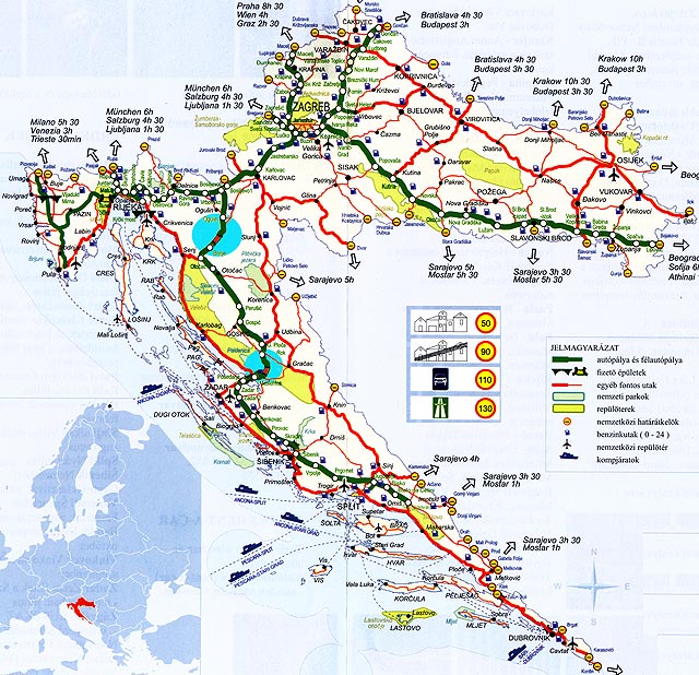 Ha lassan is, de mindegyik szezonra bővülnek az Adriára vezető vándorlási útvonalak. Igaz, arra már 2004. nyarán rá kellett jönnünk, hogy nem mindig úgy, és nem mindig annyival, ahogy a hivatalos forrásokból kiderül. Ezért nem árt felkészülni a néhol elfogyó sávokra. Irány Dél A délebbi részekre indulóknak a második bosiljevoi csomópontnál kell elfordulni Zadar illetve Split felé. Az erre utazóknak nagyon ajánlom olvasásra Marz András 2005. július közepi kirándulásán gyűjtött tapasztalatairól szóló beszámolóját. Mint ebből kiderül, a Mala Kapela és a Sveti Rok alagút elkészültének híréből csak a fele igaz, mert csak egy-egy cső készült el mindeddig belőlük. Így a több kilométer hosszú alagútak előtt egy sávra szükül a forgalom, emiatt több órás dugók alakulnak ki. András nagyon jó egérutakat javasol erre a vidékre, és azt is megírta, Zágrábnál hogyan kerülhetjük el a hasonló dugókat. Ötleteivel nemcsak gyorsabbá, olcsóbbá is tehetjük útunkat. Persze, ez csak akkor lesz így, ha a többség az autópályán marad. :) Azóta már én is megjártam az autópályát 2006. júliusban, és a Sveti Roknál rendesen meg is jártam. Abban az időpontban jöttünk visszafelé, amelyiktől mindenkit óvtunk eddig is: szombaton délelőtt. Nem kívánom senkinek a másfél órás araszolást - pedig ez még nem is számít igazán nagy dugónak ezen a környéken. Erről a Szarajevón át Hvar-szigetre című írásom második részében, a Spliten, Zágrábon át való hazaút élményei alapján írtam. (Néhány képpel és tanáccsal színesítve) A 2008. februári hírek szerint a Sveti Rok és a Mala Kapela alagút 2009 nyarára készül el teljesen. Addig az autópálya forgalma egyetlen járatban, 2x1 sávon zajlik. Tehát a fenti írásokat még a 2008-as szezonban is érdemes elolvasni és meszívlelni. A fenti vázlatot a Horvát Idegenforgalmi Közösségtől kaptuk, gyakorlatilag a 2008. nyári állapotot tartalmazza. Ha rá kattintva nagyobb méretben is behívjátok, talán el tudtok igazodni rajta. A Split (Dugopolje) utáni, Sestanovacig tartó 37 kilométeres szakasz 2007 júniusában készült el. Ezzel a Makarskára vagy a Brac-szigetre indulók is szinte végig autópályát használhatnak. Dubrobnikig az idén még 170 kilométert kell a sziklafalak oldalába vájt szerpentineken autózni. Gyönyörű a panoráma, de én már a gondolatától is szédülök. :) A távolabbi tervek szerint az autópálya 2008. december 30-ig újabb 40 kilométerrel bővül Ravcaig. Ugyanekkorra készül el további 30 kilométer Ploceig. Összesített ár kunában a magyar határtól néhány fontosabb üdülőhelyig, illetve zárójelben a hozzá legközelebb lévő autópálya kijáratig. (Utoljára 2008. júnis 1-én ellenőríztük az árakat. A napi adatokat a horvát autópálya társaság oldalán olvashatjátok)