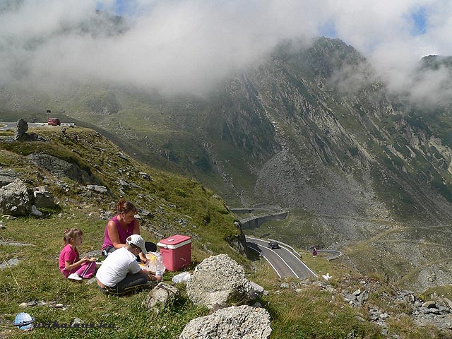 . De attól az élet nem áll meg, mert a Balea-tónál síközpont működik, ahova kabinos felvonó visz fel mindent és mindenkit. (jobbról a Bela-tó) Az út minősége jó, délen némileg foltosabb. A szalagkorlát sok helyen hiányos, az útpadka igen keskeny, gyakran az aszfaltburkolat széle egyben a szakadék pereme is. A veszélyre az út melletti keresztek és egy-egy felismerhetetlen autó roncsa figyelmeztet. A roncsokat időnként elszállítják, de általában nem kell sokat várni az újabb balesetre. Nekünk szerencsére ilyen élményben nem volt részünk. Mindenki fegyelmezetten közlekedik, a veszélyt a bámészkodó, fényképező autósok jelentik.