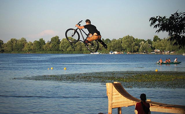 A késői ebéd után a parton sétáltunk, amikor nagyobb tömörülésre lettünk figyelmesek a strandon. A másnapi biciklis marathon apropóján akrobata biciklis bemutatót tartott néhány fiatalember. A dombról nekigurultak a kiépített fa rámpának és biciklivel együtt ugráltak a Tiszába. Egy darabig néztük őket, de amikor egy lány – aki soha életében nem csinált még ilyet -, nekifutásból akkorát esett a rámpán, hogy azt hittük ott marad, na akkor azt mondtam, én ezt nem nézem tovább. Sétáltunk tovább a töltésen, a kikötők mellett.