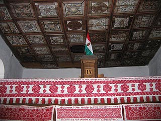 Bánffyhunyadnál megláttuk azokat a csicsás házakat, amiket a férjem korábban már látott. Teljesen kicsipkézett bádogból, rengeteg toronnyal, de egyetlen házban sem laknak. A templom a főút szélén áll, mellette parkoltunk le. Éppen akkor jöttek ki látogatók és odaadták nekünk a szó szerint NAGY kulcsot. Egyedül nézhettünk körbe, fizetni nem kellett. Ha nincs a templomnál senki, a mellette lévő parókián kérhető el a kulcs. Jellegzetes erdélyi református templom, tele kék és piros hímzett terítőkkel, falvédőkkel. A templom mennyezete festett fakazettás.