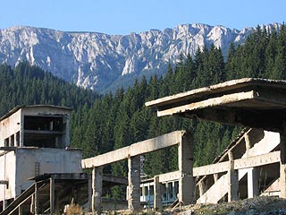 Jó lett volna még sétálni, de vártak az ebéddel. Délután a régi rézbányához sétáltunk, ahol régen a barátunk is dolgozott. A bánya teljesen lerobbant, minden csupa rom, de ha felnéztünk a gyönyörű hegyeket láttuk, a Cohart, ha jól tudom. Egészen a vízzáró gátig mentünk fel, amit ők „Dugásnak” hívnak, mert a víz el van zárva, be van dugva. Logikus. Itt az Olt folyik a hegyekből és még kristály tiszta, amíg a bányához nem ér. Onnét rozsdavörösen folyik tovább.