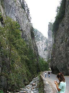 A folyó mellettünk rohant a lenti sziklákon, az út mellett ajándék árusok. Minden autó, kamion arra jön, mert az út csak arra vezet. A buszok kiteszik a turistákat az út elején, azok végigsétálnak a szoroson, a busz megfordul a következő falunál és visszafelé felveszi a csoportot.