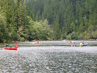 Még mielőtt megálltunk volna, jött az úton egy fiú fekete pólóban, amire az volt írva „Székely vagyok nem piskóta”. Barátunk kiszólt az ablakon, „Hát ezt mondom én is”. Itt is elég sok turista járt. A tó mellett málnát szedtünk a bokrokról. Elkezdtük körbesétálni a tavat, de közben nagyon eleredt az eső. Egy darabig álltunk a fák alá bújva, de látszott, hogy ez nem fogja abbahagyni, jobb lesz ha elindulunk.