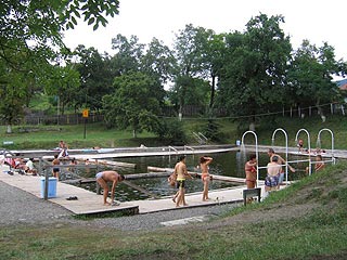 Az egész körbekerített rész nagyon kultúrált és ápolt volt. Nagyon kicsi a medence,- úszómedence méretű, annál mélyebb, 17 méter mély! Ennek a víznek a só összetétele duplája volt, mint a Medve-tónak Szovátán. A medence mellett egy beton teknőben szurok fekete iszap volt, ami biztosan nagyon egészséges, de inkább csak néztük, ahogy a helyi fiatalok bekenik vele magukat, aztán alig tudták lemosni. Melegvíz nem volt a zuhanyban.