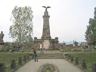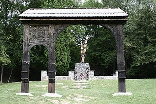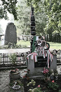 Ma a Hargita felé mentünk. Az úton már messziről látszott a három hatalmas, fekete márvány kereszt a Tolvajos-tetőn. Millenium-Csíksomlyó-Márton Áron emlékére. Székelyudvarhelyen keresztül (sajnos itt sem volt idő megállni) Szejkefürdőre mentünk, ahol Orbán Balázs sírja van. A domb tetejére, székely kapuk alatt visz fel az út. Addigra már elég rendesen esett az eső. Velünk együtt érkezett egy motoros csapat Magyarországról.