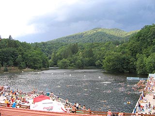 Ebéd után elmentünk Szovátára a Medve-tóhoz fürödni. Nagyon szép az új fából készült fürdőház. A víz olyan sós, hogy senki nem süllyed el benne. Igazán szép a környék. Nem csoda, hogy itt olyan sok a turista. Zárás előtt fél órával szól az első sípszó, amire hangos füttykoncert a válasz, majd háromnegyedkor és a végén 6 órakor megismétlődik az egész. Addigra már senki sem lehet a vízben, csónakból szép lassan kitessékelik az embereket. Jó alaposan le kell zuhanyozni, de semmilyen sampont és egyebet nem lehet használni. Utána szép selymes lesz az ember bőre, a sebek begyógyulnak.