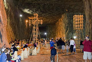 Eléggé füstölnek, főleg a hegy belsejében nehéz levegőt kapni és csípi az ember szemét. Széles lépcsőkön kell tovább menni a mélybe. A csapóajtón túl hatalmas termekben lehet az időt eltölteni. A sós padlót márványszerűre koptatták a lábak. Van itt felfújt játékvár, hinták, asztalok. Lehet együtt tornázni, van egy templom az egyik terem végén. Volt éppen egy kiállítás is Erdélyről. És térerő is van a telefonokban! Az első 10 percben teljesen elnehezedett a lábam, kivert a víz. Aztán rendbejöttem. Található lent egy fa építmény is, amiben büfé és ajándékbolt van. Parajdon van Áprily Lajos szülőháza, de mi nem láttuk, csak később filmen. Továbbmentünk Szovátára.