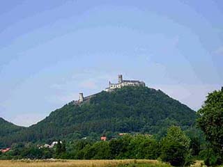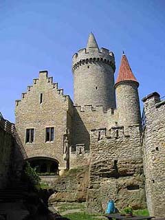 Ez egy fantasztikus, XIII. század végén épült gótikus vár, amelyhez az utolsó 2-3 km-t gyalog lehet csak megtenni, részint aszfalton, de jobbára erdei úton. Az utolsó 800 métert köveken kell felfelé kapaszkodni, igen meredek, ide autóval nem is lehet felmenni – nem lennék az építők, felújítók helyében. A végén ráfordulunk a hosszú várudvarra. Az első épület az apró gótikus kápolna. Aprósága inkább előnyére szolgál, közvetlen közelről nézheti az ember a régi mesterek keze munkáját, a hihetetlen harmóniát közvetítő kőcsipkéket. Az oltár helyén lévő lekopott szikladarab is olyan helyénvalónak ítélte-tik általam, így az itteni teljességet nézhetjük, nem zavar semmi. A fényképezőgép látószögének persze kicsi a hely, az erkélyrészre nem lehet felmenni – onnan lenne ideális a fényképezés. Az ablakok két sor-ban vannak, egy sor a külső falon, egy pedig egy belső falon. Alul ülőfülkék teszik gyakorlatiassá a lát-ványt. A kápolna folytatásában a vár főépülete van, amelynek a belső födémei hiányoznak, így a két szint minden megmaradt szépsége egyben látszik termenként – jobban mondva szobánként. A legszebb részle-tek, ahol a régi boltozatok falból indításai kezdődnek, ahol meg még egyéb is van, pl. kandalló maradvá-nya, az már egészen varázslatos. Van olyan épület is, amelynek nincsen teteje, és van olyan is, amelyet helyreállítottak teljesen – most kiállítóterem. Jó volt felmászni a kerektoronyba, s visszanézni az alul levő épületekre, és a gerincen leszaladó védművekre.