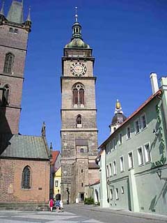 A torony tetejéből szép kilátás nyílt az óvárosra. A kis óvárosi utcákon a főtérre baktattunk, amelynek szinte minden háza szemet gyönyörködtető. Természetesen itt van a késő gótikus plébániatemplom – oromdíszei már reneszánsz stílusban készültek el. Belülről kissé vegyes a kép, bár a boltozatok szépek. A hajó “klasszikusan” gótikus, vagyis a bordák kőből vannak – ezzel szemben a szentélynél vakolt és fehérre festett mozgalmasabb későgótikus bordarendszer kápráztat el. Ez a megoldás rajzosabb, több fény-árnyék játékot mutató képet ad, a fehérségével együtt nagyon tetszett. A városháza épülete szintén gótikus épület – bár ma inkább reneszánsznak hat -, 1440-ben építették, különösen tornya emlékezetes – ezt a fajtát látjuk mindenütt az országban, a később szokásos csúcsban végződő helyett ezeknél egy, a homlokzattal párhuzamos gerincben végződő toronysisakkal találkozunk. A múzeumban az egyetlen igazi érdekesség a huszita szekér másolata – bár ez a kapulajban van, így akár belépőjegy nélkül is megnézhető. A többi – a huszita mozgalommal foglalkozó terem – nem annyira érdekes, főleg, hogy minden másolat és reprint, esetleg nagyítás. A Panoráma keskeny sorozat 1983-as kiadásában szereplő “rendkívüli élmény” nekem nem jött be, bár ez csak a múzeum megnézése után derülhetett ki.