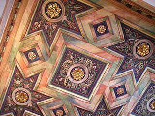 , csak akkor látszott, amikor már odaértünk. Egyébként kellemes város, több jó épülettel. A Szent Bertalan késő gótikus templom, némi reneszánsz beütéssel, festése ornamentális díszítésű, de jóval későbbi. A szentély felől nagyon kecses. Ezt követően a várkastélyt néztük meg, amely gótikus eredetű, de a reneszánsz külső és belső alatt ezt elég nehéz észrevenni. Kívül felújított sgraffitó díszítésű, belül pedig nem kevés feskórészlet maradt meg. A gazdagon díszített teremmennyezetek él-ményszámba mentek. Végül a kis utcákon a főtérre mentünk, amelyet szokásosan szép és rendbe tett házak öveznek. Itt van a Zöld-kapu is, amelynek erkélyéről remek kilátás lehet – sajnos épp déli szünetet tartottak, így erről le kellett mondanunk.