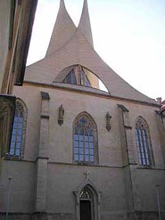 A harmadik rotunda következett, a Szent Longinus, amely XII. századi, és a legkisebb a három prágai közül. Ennek a bevilágítója nyolcszögletű, a falai nagyrészt vakoltak, ezekben eltér a másik kettőtől. Az utunk az Emmauszi-kolostor felé vitt, amely a 45 év után újra a bencéseké, ahogy 1347 óta is volt. A II. világháborúban megsemmisült a tornya, ezért egy modern, vasbeton kettőstornyot emeltek, ami az összhatást nem is rontja el – icipicit emlékeztet Rouen modern, de hasonló okból gótikus templomrészeket magába foglaló templomára. Itt épp misére készülődtek, így bejutottunk a gyönyörű templomba. Három hajója azonos magasságú, oldalfalain a világháború viszontagságait túlélt freskórészletek vannak, 1360-ból. A szentély boltozatán a kazettákban itt is címerek vannak. A jobboldali kápolnában a teljes külső fali freskó megmaradt, a teljes kompozíció látható. A Szent Vencel-templom szintén a Cseh Testvéreké, így csak kívülről csodálhattuk meg az újabb XIV. századi gótikus templomot – a belseje pedig szép boltozatot és freskót rejt. Egy pillanat erejéig a modern építészet jó példájaként emlegetett Ginger és Fred elnevezésű irodaház mellett mentünk el. Érdekes épület, ezzel együtt nekem egy jó kis gótikus épület sokkal többet ad. A Moldva partján a Sítkovi víztorony XV. szá-zadi, később reneszánsz stílusban újjáépített épülete mellett mentünk tovább. S jött a Szent Adalbert-templom – szintén kívülről. Román indítását ma már nem látni, de a gótikus stílus még mindig a legjel-lemzőbb rá, ám barokk beütésekkel – egyébként itt volt orgonista 4 évig Dvorák. A következő megállító épület az Újvárosi városháza gótikus és reneszánsz elemeket mutató épülete. Maga az épület és a tornya impozáns, kár, hogy a nagytermébe nem lehetett bemenni – pedig megpróbáltuk. A Vencel tér mélyebb végénél kicsit vissza kell kanyarodni, és ott találjuk a Havas Boldogasszony templomát, 1347-ből. Európa egyik legkarcsúbb templomának mondják, valóban igencsak nagy a magassága a hajó szélességéhez viszonyítva – úgy 3-4-szeres. A boltozata gótikus, díszítése azonban valóban reneszánsz lehet (csillagos), ahogy a könyv írta. Óriási élmény, és itt alig néhány ember nézelődik, a Vencel tér forgalma után különösen jól esik egy kis nyugalom. Folytattuk a gótikus listát a Szent Henrik-templommal és az utca közepén szigetszerűen emelkedő Henrik-toronnyal. Ez utóbbi 1475-ből való, vagyis mintegy száz évvel fiatalabb a templomnál. Maga a templom is gótikus, a kisebb, egybeépített tornya reneszánsz sisakot kapott; oldalába itt is sírkőlapokat építettek. Mellette nagyon szép sgraffitós épület van, 7 angyali-emberi alakkal, de nem tudom, mit jelképeznek, talán a hét szabad művészetet, de lehet, hogy teljesen mást.