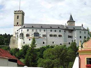 A kastély egy igen jellegzetes, emblematikus és méltán híres reneszánsz épület – egy régi várból átépítve. Monumentális, mégis könnyed, vidám hatása van. A XVI. század második felében építették át, van benne minden, ami egy ilyen épületben kell, sajnos épp zártak, amikor odaértünk. A falakat kívülről sgraffitó díszíti mindenütt. Ez a reneszánsz korban igen kedvelt technika volt, a falat egy alapvakolattal látták el, majd egy másik színűvel újabb réteget hordtak fel. Ezt követően a felső réteg levakarásával mintákat, rajzolatokat készítettek – a két színt így használták. Ezzel a technikával rengetegszer találkoztunk Csehország minden részén, változatos díszítéseket készítettek az egyébként sima falakra – néhol párkányzatokat, máshol grafikus rajzokat, óriási képeket, bordűröket. Az épület földszint + két emelet magas, szép árkádsorral a folyosókon, amelyek közül egy a homlokzaton is díszül szolgál. A kápolna ablakai gótikusak, de az egész hihetetlen harmóniában van a reneszánsz stílussal. Van még több kiszolgáló épület is, amelyeket szintén felújítottak az utóbbi években. A kastély parkja egy szabadtéri színházban végződik, ezt csak a kastélytól néztük. A közelben volt még a Vörös torony, amely szintén a középkori épületek egyike. Egy fedett lépcsőn leereszkedtünk a főtér felé, útközben még egy apró gótikus templomot körbejártunk – sajnos ez is zárva volt, pedig szép, tiszta vonalai voltak. A főtér lábas házak sorával, és egy reneszánsz városháztoronnyal dicsekedhet. Körbejártunk, kellemes hely – a lábas házak alatt mindenütt üzletek, kávézók vannak, s természetesen információs iroda. Egy szép tornyot is láttunk még, de ellenfényben csak az – egyébként nekem nagyon tetsző – sziluettjét.