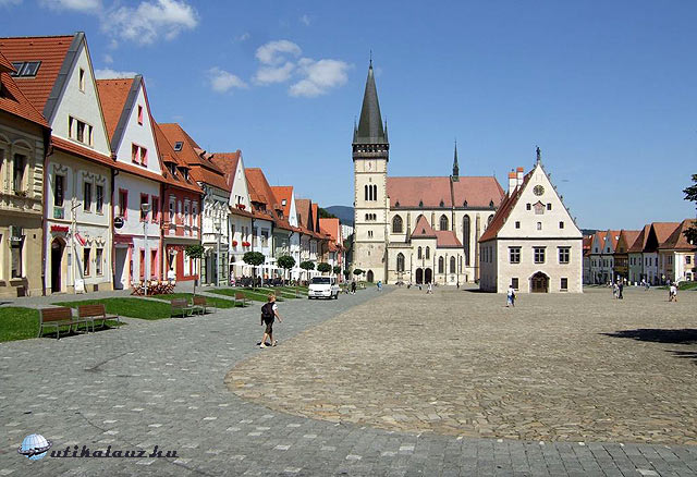 Bártfa a Szepesség egyik fontos ipari, kereskedelmi és szellemi központja is volt a történelem során, a tatárjárás utántól jelentős német népességgel. A városközpont mai képe is ezt mutatja, azonban itt egy téglalap alakú, lejtős főtér fogadja a látogatót, melynek a középső részén a régi városháza áll, és a templom -meglepetésre- az alsó részt zárja le keresztben. A teret övező, általában gótikus vagy reneszánsz indítású, kisebb-nagyobb mértékben átépített épületeket rendbe tették, így érdemesültek az UNESCO világörökségi listájára való felvételre. Természetesen a gyalogosoké a főtér, ahol turista információs iroda is van, szép képes könyvekkel az ország műemlékeiről, természeti szépségeiről – többféle nyelven is. A régi városháza most múzeum – mi nem mentünk be, az útikönyv pedig sok szépet ígért a gótikus és reneszánsz korából.