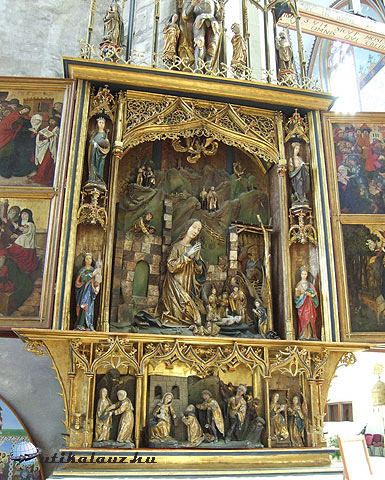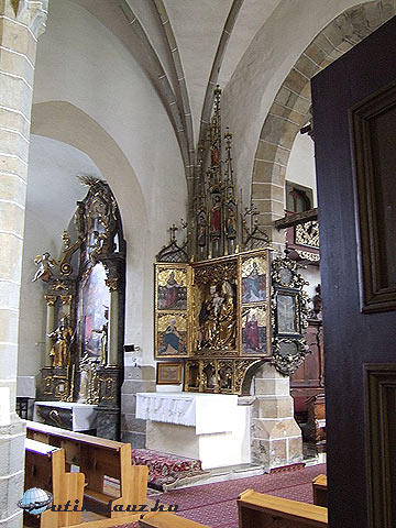 A nap utolsó helye – tovább ugyanabban az irányban – Héthárs lett. Itt egy reneszánsz stílusban átépített XV. század végi gótikus templom áll, melynek belseje megőrizte a gótikát és igen értékes, eredeti berendezése van – oltárok, Lőcsei Pál mester szobrai, szószéke. Ennek megfelelően nem is jutottunk be, csak az üveges ajtóval lezárt „belépőig”. Ami keveset lehetett látni – az oltárt -, az megerősítette a leírásokat, de valójában csak a meg nem látás fájdalma lett nagyobb.